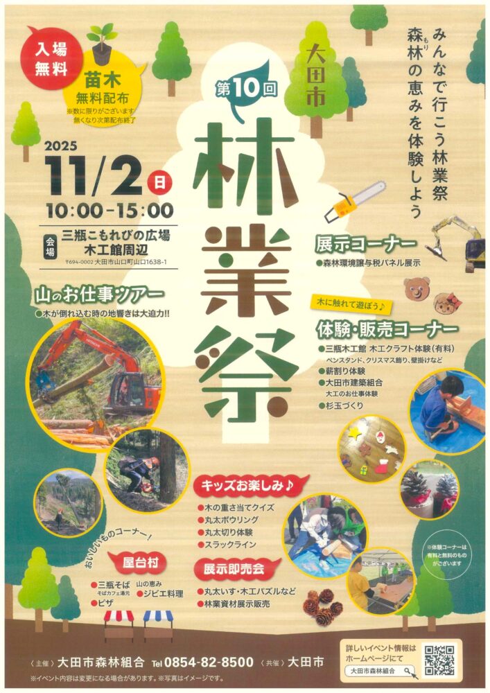 11/2(日)三瓶こもれびの広場 木工館周辺で林業祭開催します。木工館は板をノコギリで切って組み立てるペンスタンド、松ぼっくりツリーなどのクリスマス関係の体験をたくさん準備しています。チラシ掲載のほか、三瓶フィールドさんは体験、山の駅さんべさんはアロマ体験もされる予定ですので、ぜひお越しください!