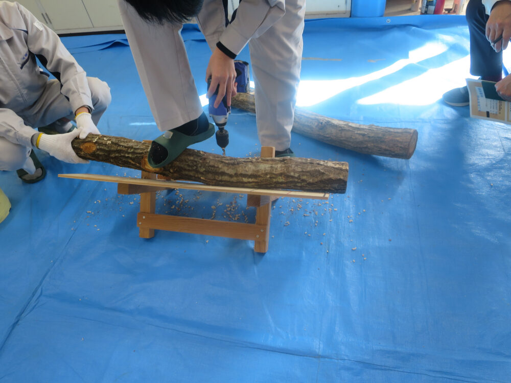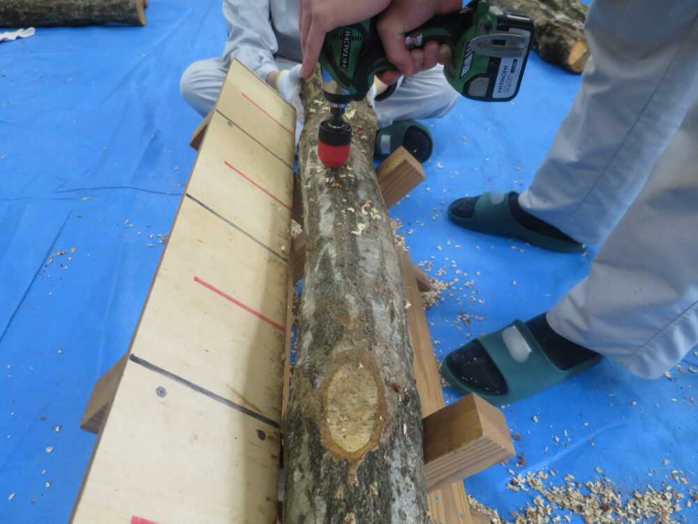 次は植菌!種駒の向きに注意して金づちで💪
